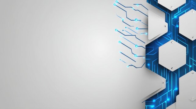 Abstract digital background featuring glowing hexagonal patterns and vibrant blue and orange lights