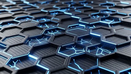 Glowing blue molecular structure with hexagonal cells on dark background representing science and technology concepts