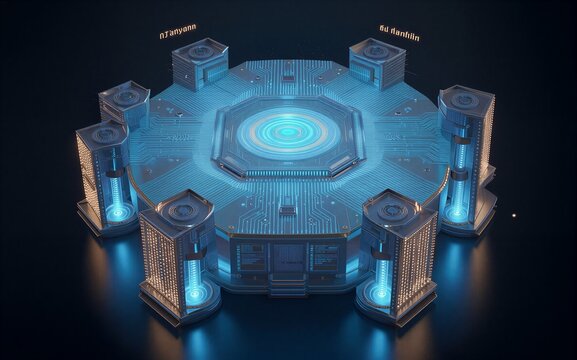 Futuristic blue circuit network, glowing hexagonal nodes connected by data streams in dark space.