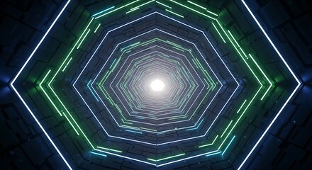 A glowing green hexagonal tunnel leading into infinity, illuminated with vibrant neon lights and a futuristic aesthetic.