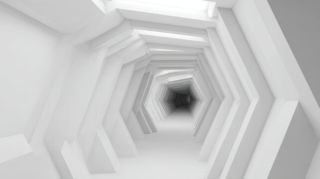A futuristic hexagonal tunnel with glowing neon blue and purple lights creating a sense of infinite digital space and advanced technology
