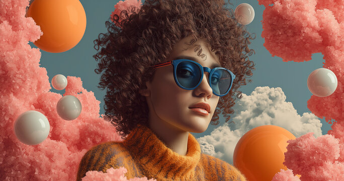 fashion model with curly hair and blue sunglasses is surrounded by floating pastel pink clouds, pink flowers, white spheres, and dark orange bubbles. the background color of the sky is blue. high-reso