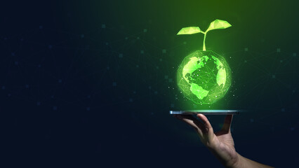 Plant sprouts growing with earth on mobile in hand.Low polygon.Agriculture green technology and environment concept, ecology system.Hi-tech and futuristic.Digital and technology concept background.
