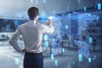 Businessman in suit using tablet device to optimize development by implying new technologies in business process. Interconnections and hi tech hologram over modern panoramic office background