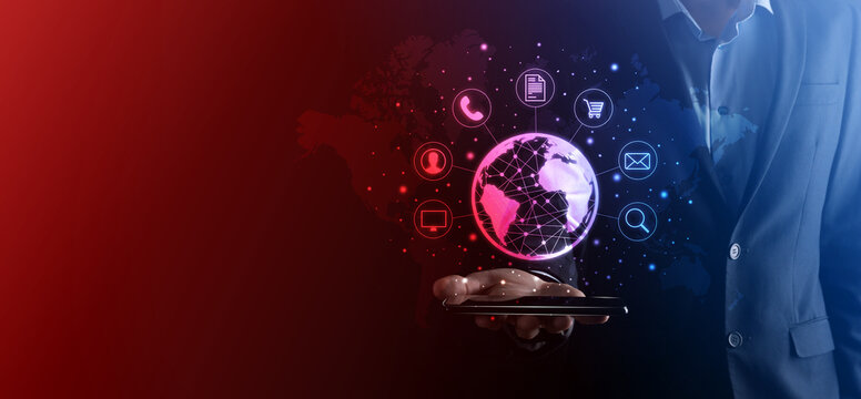 Business man hiold, use,press infographic icon of community technology digital.Concept of hi tech and big data. Global connection.IoT Internet of Things . ICT Information Communication Network .