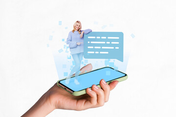 Modern hi tech design collage photo mature female hologram telephone touchscreen google assistant helper system navigation typing text