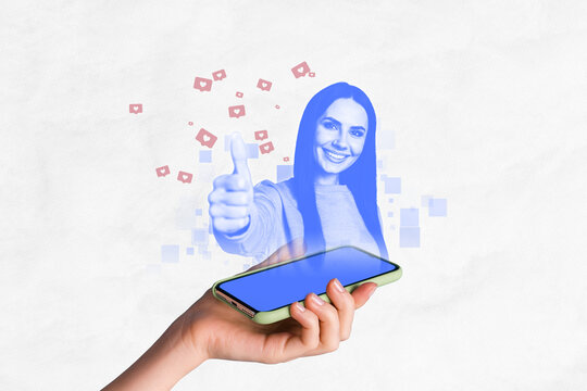Hi tech conceptual collage of young girl hologram picture under big smart phone touchscreen giving thumb up rank best quality