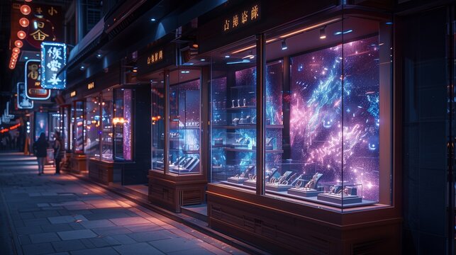 A nighttime view of a jewelry store with a holographic display showcasing shimmering jewelry in its storefront window.