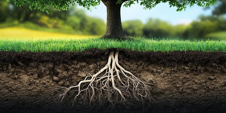 Cross-section illustration of a tree and its extensive root system, demonstrating the hidden strength and complexity beneath the surface..