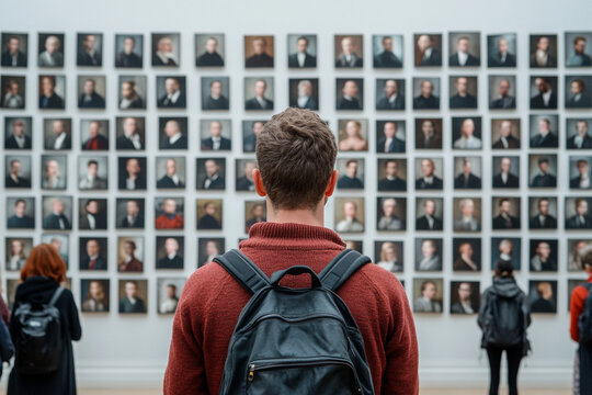 A museum visitor using an app to explore hidden digital layers in famous paintings