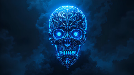 A mysterious, glowing blue skull with ornate, swirling patterns and Tribal-inspired details, set against a dark, misty background, evoking a sense of mysticism and rebellion.