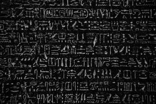 Mysterious ancient Egyptian hieroglyphs carved into weathered stone surface with authentic archaeological atmosphere