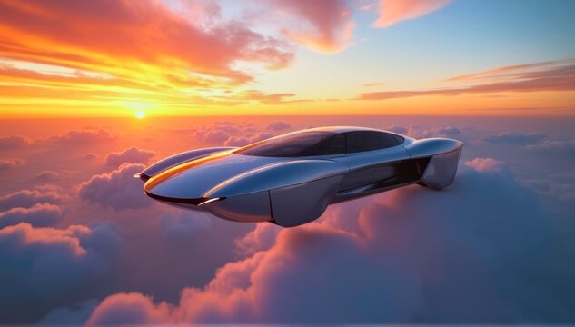 Floating filmstrip walkway gliding above clouds toward sunrise