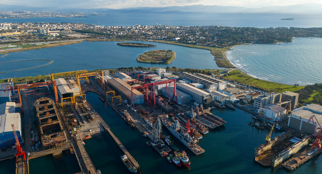 High altitude drone shot of the industrial shipyard district contrasting with the natural beauty of the nearby coastline and islands under a bright blue summer sky