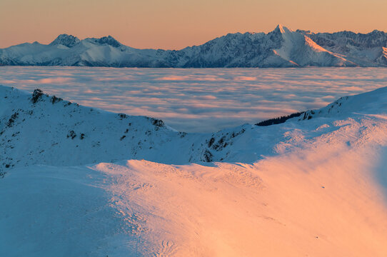 Breathtaking sunset over mountain range and sea of clouds