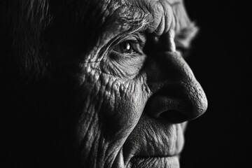 A side profile of a distinguished elderly man with deep wrinkles and a thoughtful expression, black and white photography, high contrast, sharp focus, dramatic lighting