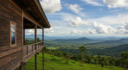 Wooden Cabin Balcony Overlooking Lush Green Valley and Mountains Under Cloudy Sky