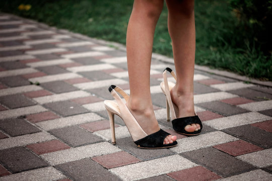 Legs of cute girl in elegant shoes with high heel, girl power concept