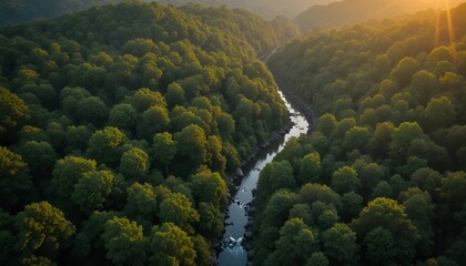 “4K aerial view of ancient dense forest with winding river, golden hour light, high dynamic range, ultra sharp details, cinematic color grading, nature documentary style”