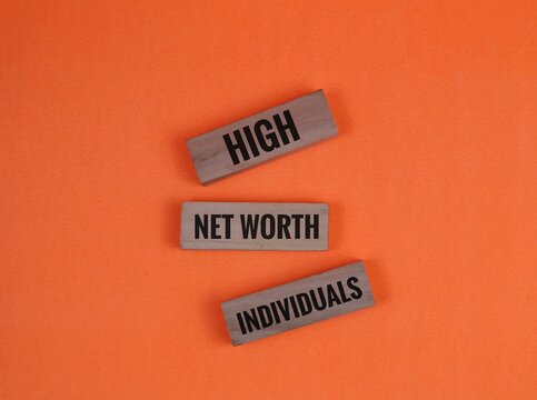Wooden block with the words 'high, net worth, individuals' on an orange background. The concept of wealth and finance.