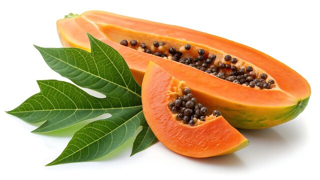 Fresh Tropical Papaya Slice with Green Leaf on White Background – High Quality Image