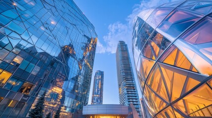 From below of entrance of office building next to contemporary high rise structures with glass mirrored walls and illuminated lights in calgary city against cloudless blue sky