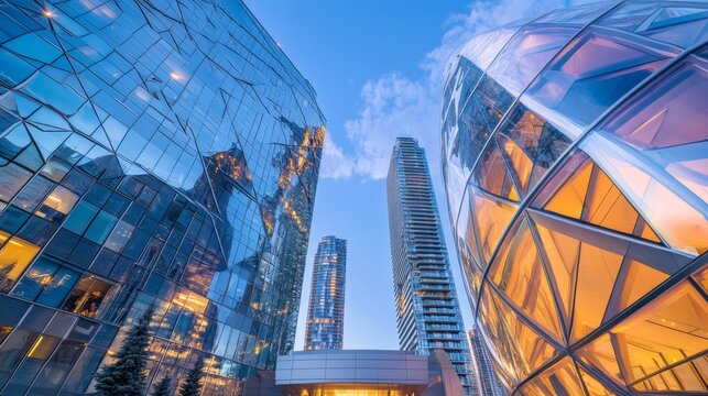 Skyward View of Skyscrapers: A low-angle perspective captures a breathtaking sight of towering skyscrapers piercing the azure sky, emphasizing the immensity and ambition of modern urban architecture.