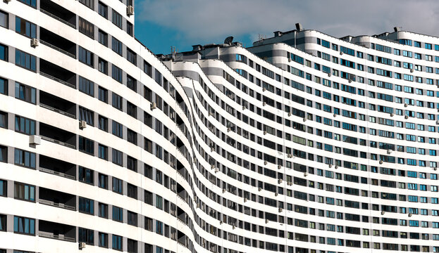 Modern high-rise condominium with a wavy, curved shape in a metropolitan city. Unique architecture, geometric design, concrete facade, and windows. New residential development offering accommodation,