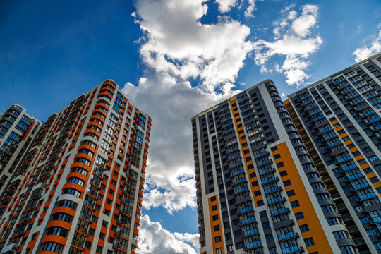 freshly built high rise apartment buildings on blue sky background with white clouds.