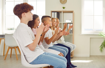 Education. Group of junior high school students joyfully applauds after interesting educational presentation. Side view of smiling classmates in class sitting in row on chairs and clapping hands.