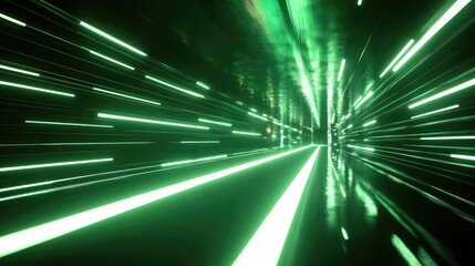 Abstract digital tunnel featuring vibrant green glowing light lines moving at high speed, creating a dynamic visual representation of data transfer, connectivity, and technology flow