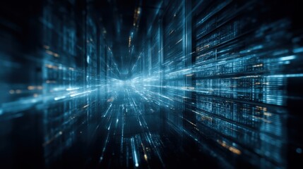 Glowing abstract data tunnel in blue and purple, streaming binary and particles through a futuristic network grid to depict ai, big data, high speed information transfer and connectivity