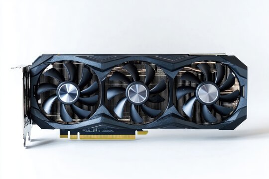 High performance graphics card with three fans and gold accents against black background, cut out transparent