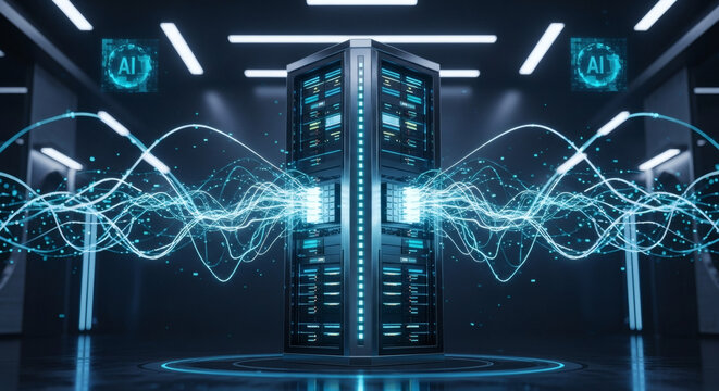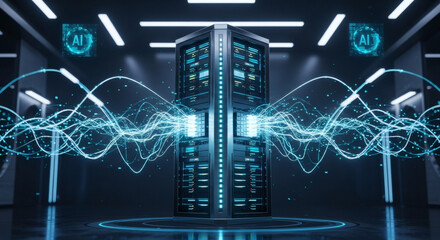A futuristic AI supercomputer in a high-tech data center with glowing blue energy waves representing data processing.