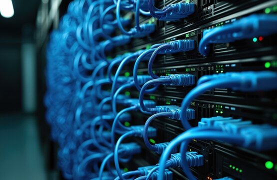 Close-up shot of network cables plugged into server rack units. Blue ethernet cords connect equipment in a data center. Server room infrastructure with blinking lights shows digital connection.