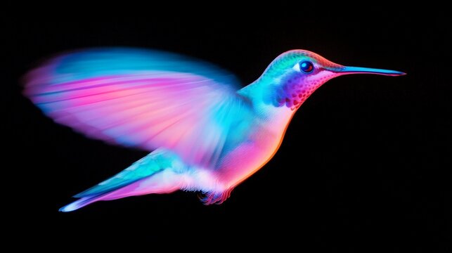 Colorful hummingbird in flight showcasing vibrant wings in high speed motion against a dark background