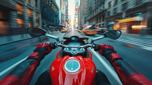 A red motorcycle rides through the city streets, the speedometer shows high speed and a blurry image behind it. The first-person camera angle conveys an exciting sense of movement.