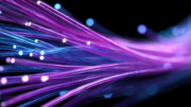Abstract Fiber Optic Cables with Blue and Purple Illumination for High-Speed Data Transmission