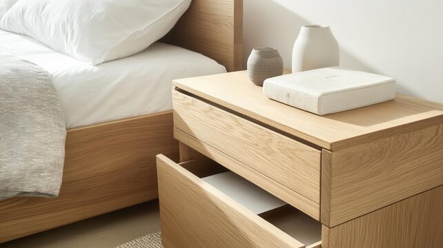 Produce a high-angle view of sleek oak bedside tables with a modern twist, emphasizing clean lines and minimalistic design, suitable for a contemporary bedroom