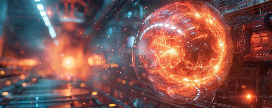 An ultra realistic image of a futuristic energy sphere harnessing the chaotic beauty of fusion reactions glowing intensely in the heart of a high tech laboratory