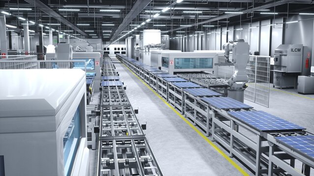 Robotic arms in cutting edge solar panel factory handling photovoltaic modules in high tech automation process. PV cells manufactured in sustainable facility, 3D animation