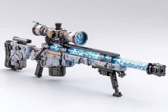 Futuristic sniper rifle with transparent barrel, blue energy core, advanced scope, metallic finish, and sci fi design, exuding powerful and high tech appearance