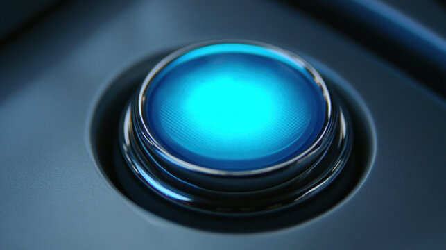 Close up view of glowing blue button, featuring sleek metallic design and smooth surface. button emits soft light, creating modern and high tech appearance