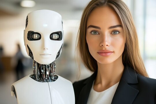 Woman with a professional appearance standing beside a humanoid robot representing the collaboration and partnership between humans and machines in a high tech corporate setting