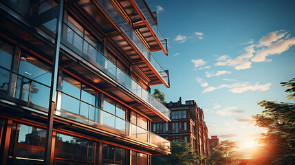 An engineer inspecting the installation of glass curtain walls on a corporate headquarters, Curtain wall inspection scene, Corporate office construction style