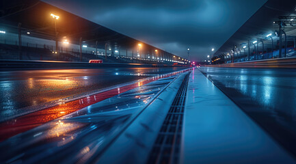 High tech space, race tracks, grandstands, midnight, blue elements, spectators. Generative AI.