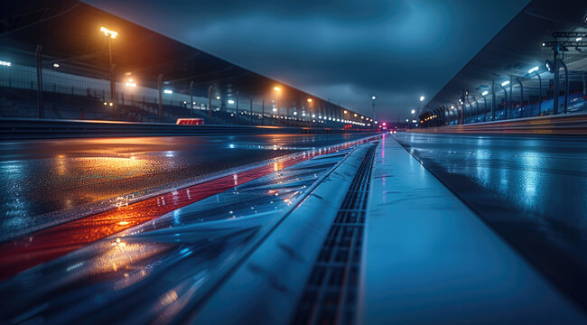Race Track Arena with Spotlights. Empty Racing track with grandstands, shooting in the middle of the racing track and starting point