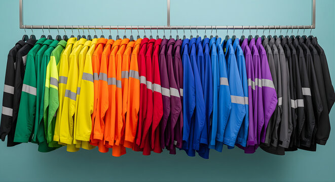Row of Colorful High Visibility Safety Clothing on Rack for Construction and Manufacturing Industry and Workwear Garment Uniform and Personal Protective Equipment