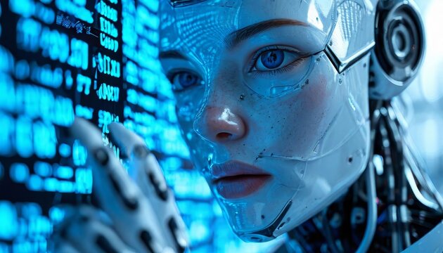 Robotic android with glowing blue eyes scanning complex digital code, touching holographic interface in high tech laboratory setting