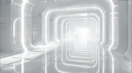 High-tech futuristic corridor with neon digital panels and glowing floor